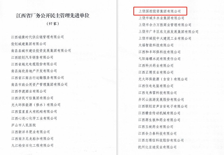 近日,上饒國控集團榮獲2023年度“江西省廠務(wù)公開民主管理先進單位”稱號,全省共97家企事業(yè)單位被命名。